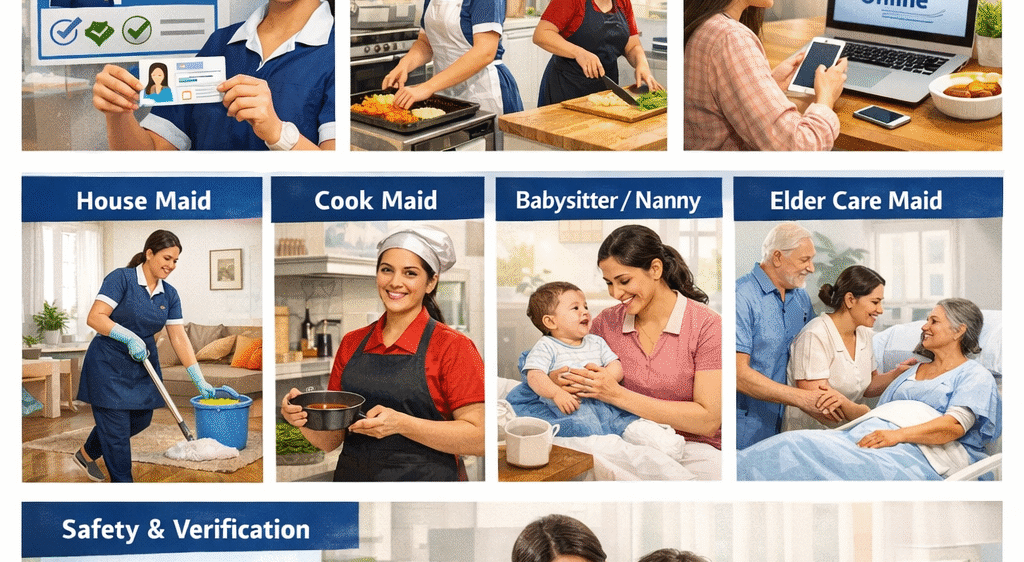 Babysitter for working parents babysitter maid cleaning maid Cook hiring for home Domestic help India Elder care support staff Full-time maid services full time maid House maid hiring house maid services Part-time home helper part time maid patient care Professional home cleaning Reliable home assistance trusted maid agency in India